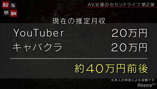 以她7萬多訂閱戶創造的流量她一個月可以有20萬日幣左右的收入(合台幣約5.9萬),另外,她也有在AV女優限定的酒店出勤陪酒,一個月也差不多能賺20萬日幣,所以她一個月總共有40萬日幣可用(大約11.8萬台幣):