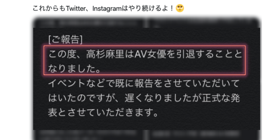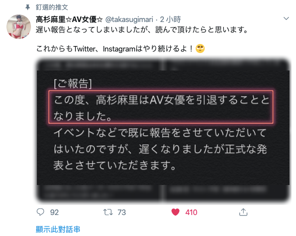 2017年於片商Moodyz出道、曾打進FANZA(就是DMM啦)單月銷售排行榜前10名的高杉麻里今天早上宣布引退,她所有的拍攝工作已經在去年年底消化完畢,最後一場活動則是定在4月下旬⋯