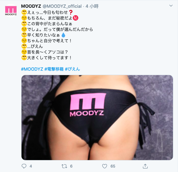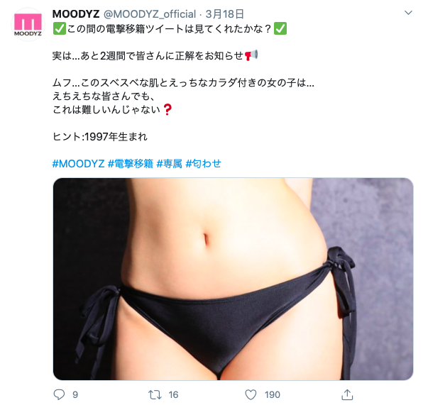 同屬Wil集團一員(原CA,北都集團)的片商Moodyz就在官推上宣布將有好手報到ー首先要注意的是「電擊移籍」這四個字,這代表這位女優並非是新手,而是在某片商擔任專屬女優的高手;再來,Moodyz公布她是1997年出生、比夜影小兩輪的新鮮肉體,很Juicy很好吃〜