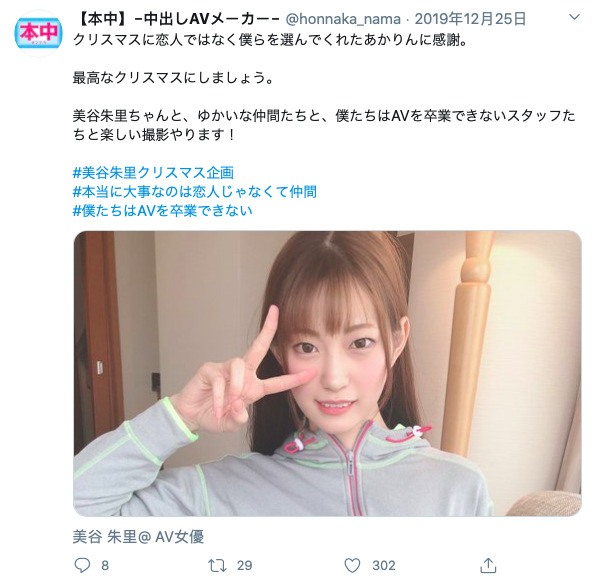 因為她在網路上還是很活躍,所以沒什麼好擔心的,但對「本中」這家片商可能就不一樣了ー眾所皆知,在上原亜衣退休後這家中出片商選定的接班人就是椎名そら(椎名空),只是因為強逼拍片風暴發生,拍好的「100人X中出し」從此被封印,同志形象愈來愈強烈的椎名從此走出了另一條路⋯