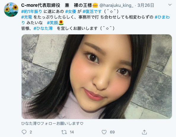 C-More社長的twitter寫得很清楚,ひなた澪(日向澪)充飽電了,也就是說休了一年半後她滿血回歸了;而從這位女優回歸後沒更換事務所的狀況來看她之前應該是和大家合作愉快的,現在要做的就是一面把人氣找回來一面請片商多多指教賜予工作機會〜