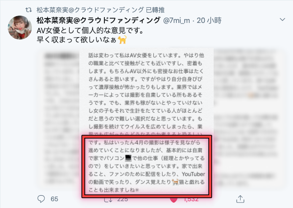 就和絕大多數的日本人一樣,松本菜奈実一開始也不把肺炎放在眼裡,覺得自己年紀輕身體器官新完全沒有感染的風險;不過在奧運延期後每天瘋狂飆升的確診人數嚇到她了,反覆思索後她覺得拍片真的非常危險,就算現在的片商要求全員戴口罩量體溫還要噴酒精消毒她還是不安心,既然如此,與其疑神疑鬼地和男優親密接觸還不如斷絕一切有可能感染的途徑,所以她先封鮑了: