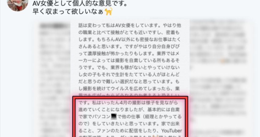 別誤會,我不是來寫醫藥新聞的,而是肺炎的疫情已經影響到暗黑界的運作。大家還記得吧,知名男優しみけん(清水健)不久前在Twitter上爆料說有片商在黃金週之前都停工,而隨著疫情日益嚴重,也有女優決定要休業了:
