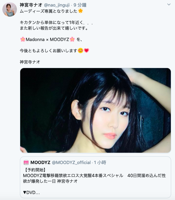 神宮寺自己已經在twitter上宣布了,即日起卸下片商「本中」的專屬女優,日後她就是Madonna和Moodyz兩家片商共同持有的專屬女優ー