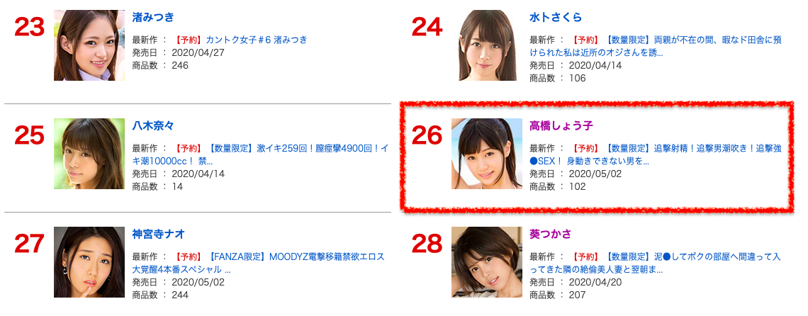 只是話說回來,不知道有沒有朋友注意到?高橋しょう子(高橋聖子)上個月的銷售排名退得很厲害ー