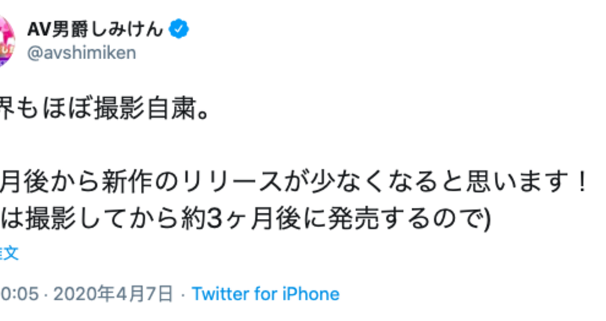 沒錯,無孔不入的病毒讓安倍政權宣布緊急事態也讓暗黑界的運作出了問題,之前男優しみけん(清水健)爆料說有片商決定在黃金週前都不拍片,現在東京進入緊急事態更讓許多片商停止運作,最直接的影響就是ー