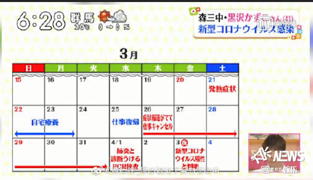 41歲的黑澤是日本最大經紀公司之一「吉本興業」旗下藝人,團體另2位40歲的大島森三中於3月25日一同錄影,但另2人目前尚未出現任何症狀,至於黑澤的染途徑則不明。報導指出,黑澤沒有咳嗽等呼吸道問題,肺炎的症狀也已經好展,但味覺、嗅覺尚未恢復。
