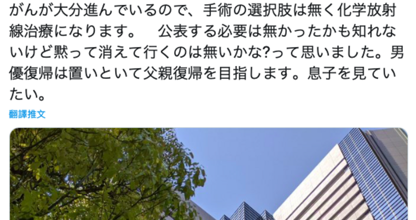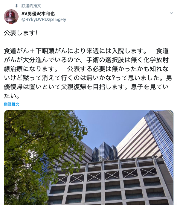 因為健康真的很重要,著名的男優「沢木和也(澤木和也)」就在twitter上自爆罹患食道癌及下咽癌,下週就要去花療了: