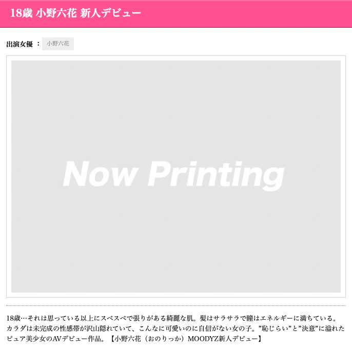 我講的是片商Moodyz預計要在5月13日發行的作品「18歳 小野六花 新人デビュー」:很奇怪,明明是新任的專屬女優,還要發行藍光片,照理來說是要大力宣傳的,怎麼會沒有封面沒有劇照?