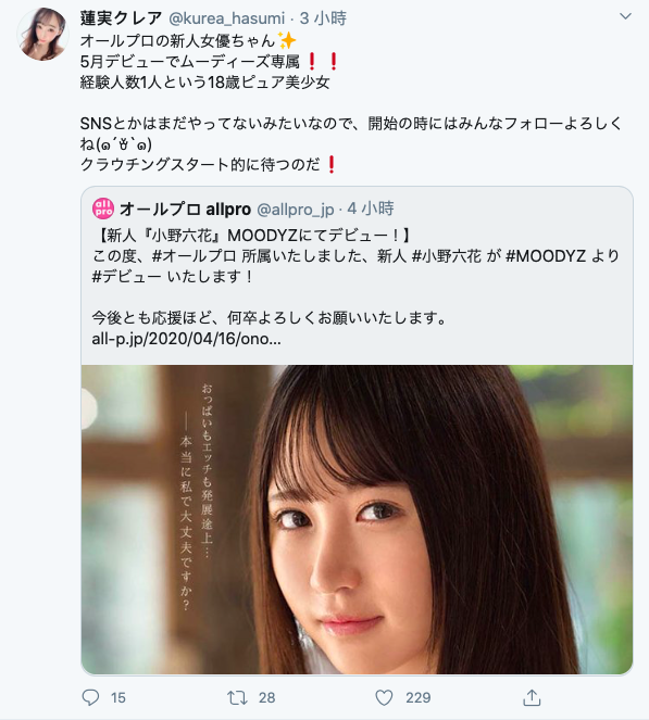 但有些事情倒是可以分析分析:小野六花的經紀公司是ALL Promotion(所以蓮実クレア出來力挺同公司的後輩),這間事務所非常擅長打造發片機器,目前在當專屬女優的只有50歲的甘乃つばき(甘乃椿,Madonna);而他們上一個在大型片商長期專屬女優是誰呢?那就要追溯到2018年的九重かんな(九重環奈)了: