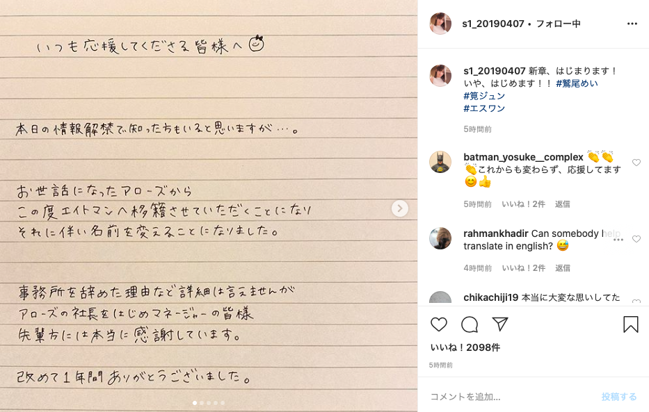 最後,鷲尾めい(鷲尾)今天也發長文說明自己的心情,除了感謝之前事務所Arrows的照顧外也提到了自己更換事務所為8MAN的原因:有看筆者之前的文章就知道她是在共演的時候覺得葵つかさ(葵司)超美超酷是值得追隨一輩子的前輩,所以決定跳槽和前輩一起工作;至於8MAN是用了什麼魔法讓換了名字的她還留在S1呢?開玩笑,她不但是S1這兩年出道片賣最好的女優,這一年來她的銷售成績也一直很穩定,不留她,留誰?