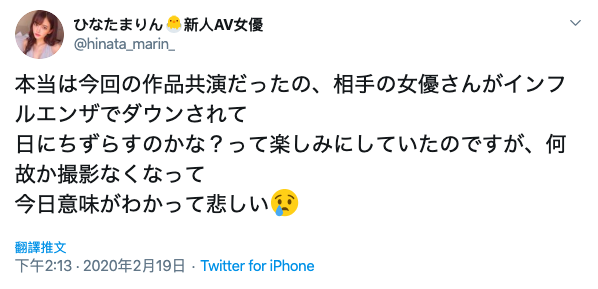於是第二個被解開的謎團就是夏希まろん(夏希栗)的去留問題:在2月第一次嘗到中出的滋味後她就暫停發片了,像她這樣辣妹路線的麻豆系女優不多,很多人都想知道她還要不要玩下去ー其實有在注意twitter的朋友都知道,夏希まろん(夏希栗)健康出了點問題,喉嚨不太舒服,但她仍是ideapocket的一員,不久前還透露說自己的拍攝行程因為肺炎疫情延期了: