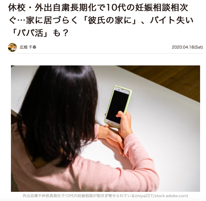 為什麼?因為日本全國進入緊急狀態,這些少女沒書唸沒工作還不能亂跑,所以有些人就待在男友家裡有些則是用援交的方式來滿足自己的金錢需求。我們都年輕過,都有興致一來不管有沒有套子就乾柴烈火的經驗也都聽過朋友嫖妓無套中出,於是就有很多女孩被播種懷孕了⋯
