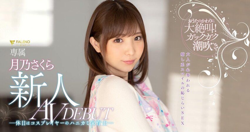 和其他新人都很快登錄twitter和影迷交流不同,到目前為止月乃さくら(月乃櫻)還是很神秘,沒有事務所出面認領這位女優;不過看到封面上的「保育士」三字你就知道她是什麼來歷了ー是的,和蒼井そら(蒼井空)及小倉奈々兩位大前輩一樣,月乃さくら(月乃櫻)在下海前是幼稚園的保母,讓人能感受母性的光輝: