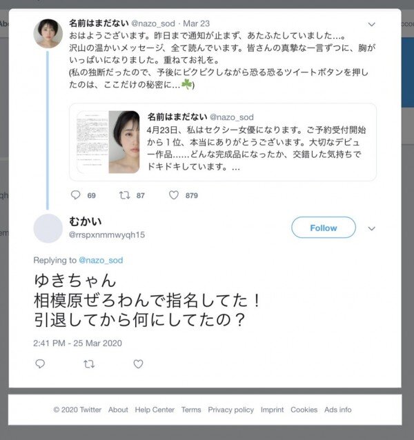 果然,在2月隨片附贈的特典影片引起關注後,正式發片的她一飛沖天,雖然沒有藝名會讓人不知道怎麼稱呼,但接下來她的片商SOD STAR應該會挑個最好的時機公布她正式的藝名,再來給她賺一波〜
