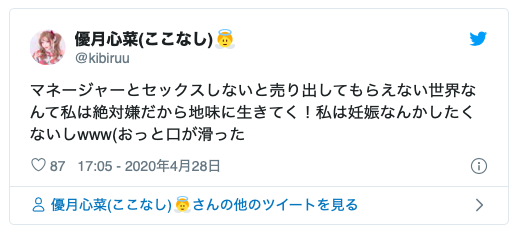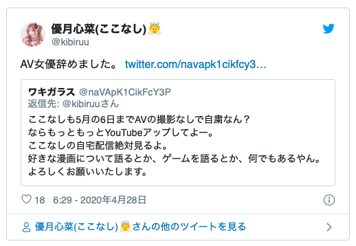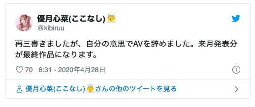以過去輝煌的資歷與在AV Open上拿到的好成績,應該很多人認為優月心菜會換個事務所再出發吧?不過她昨天在twitter上明確表示已經辭去AV女優的工作,5月的片子就是她的告別作了:
