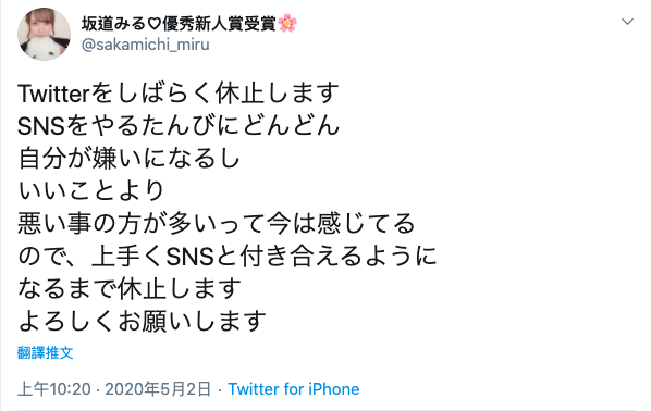 這也是事務所T-Powers繼桜空もも(櫻空桃)後再傳出有女優拒絕更新SNS(社群網站)。從目前殘餘的推文可以看出坂道的心情非常不好,但她話也沒說死,也許有朝一日會回來繼續更新twitter,但要等多久恐怕連她自己都不知道: