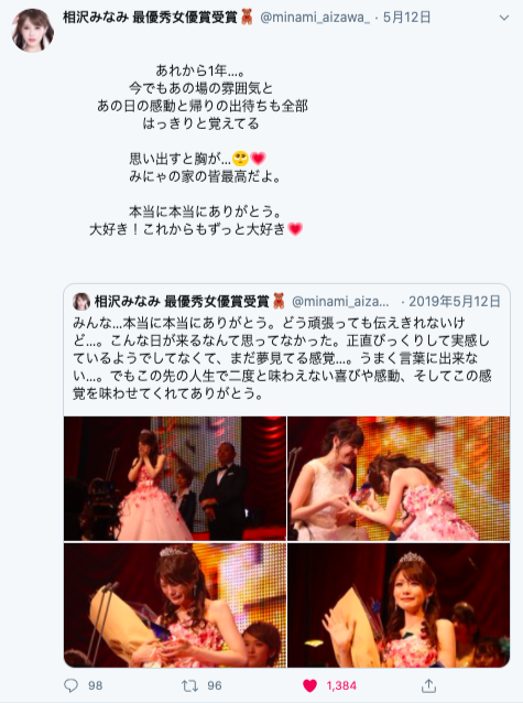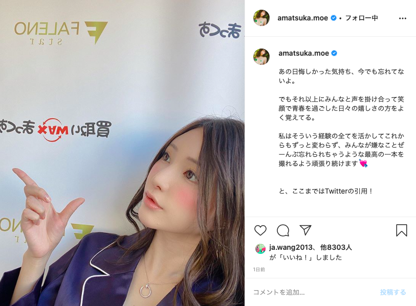 相沢みなみ(相澤南)比較簡單,她在Twitter上告訴大家當時在場上發生的一切到現在她還忘不了,非常謝謝粉絲們的支持;而天使もえ(天使萌)則是在IG上非常嚴肅地發了一篇長文,我簡單摘要如下ー