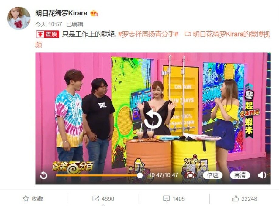 原來明日花綺羅去年 5 月底來台工作,也到《娛樂百分百》宣傳,節目中她為了品嘗台灣美食,要完成幫羅志祥穿襯衫的任務,手貼電療貼片的她被電到哀哀叫,不過明日花綺羅途中不斷撫摸他的胸肌與腹肌~~還不吝嗇誇獎「胸肌很棒,摸起來很舒服」如此親密互動引發討論。而在周揚青與羅志祥分手後,有網友發現明日花綺羅的微博置頂了該節目片段,並打上中文「只是工作上的聯絡」,當時被解讀為撇清關係。