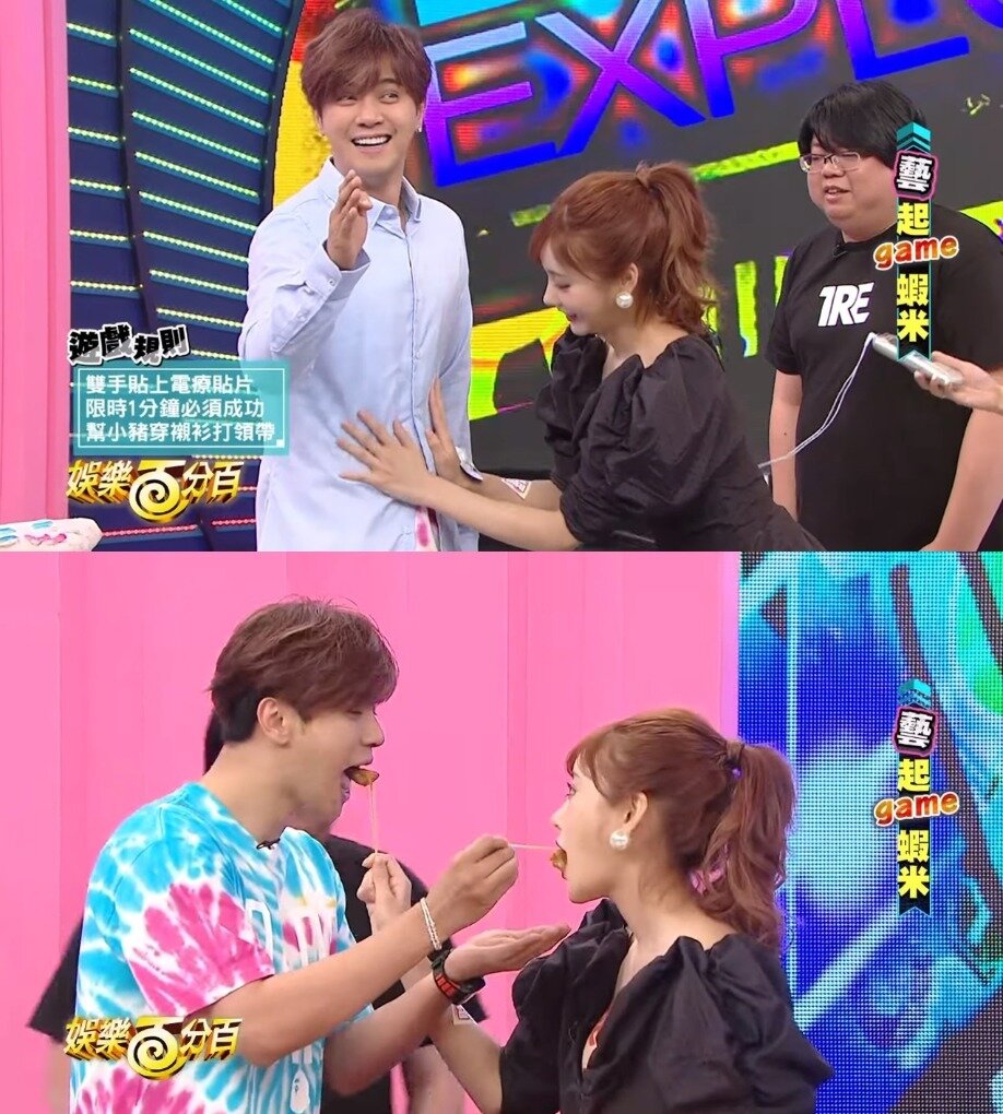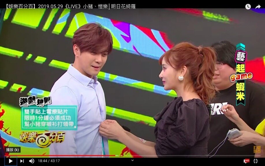 我們看到影片中明日花綺羅身穿黑色深V蛋糕短裙,不但露出渾圓酥胸,一雙又細又白的美腿更是成功吸睛。製作單位當天準備台灣夜市小吃,但條件是明日花綺羅要一邊被手貼電療貼片,一邊在一分鐘內幫羅志祥穿襯衫、打領帶,明顯自肥的環節讓羅志祥故作驚訝地問:「我嗎?」