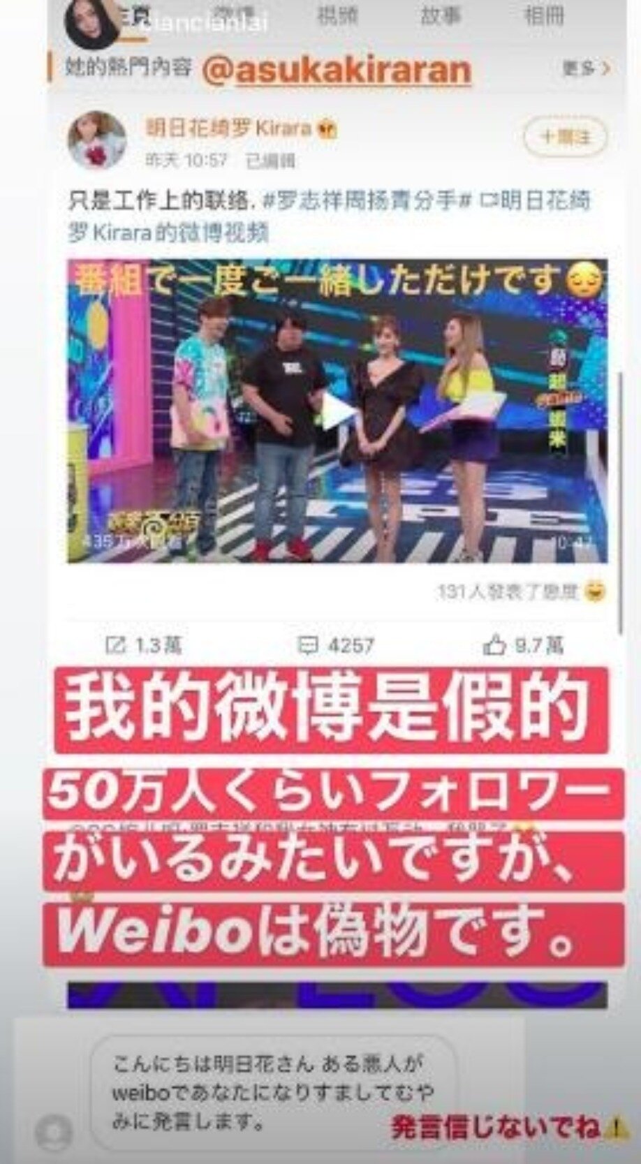 當大家對於天后跟羅志祥這段關係開始抽絲剝繭打算當柯南發現真相時,明日花綺羅就在官方 IG 發布限時動態,開門見山用中文打上: