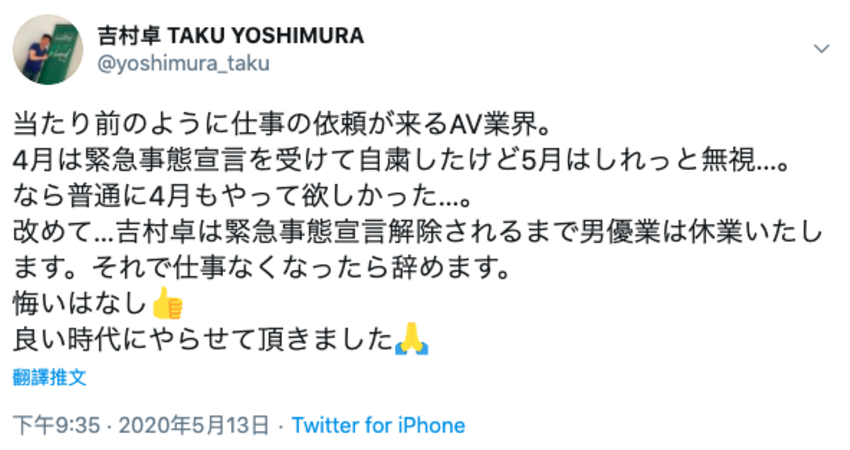 吉村卓這一寫馬上就獲得了來自影迷及業界的應援,大家都希望他不要離開。不過話說回來,相信大家也都理解為什麼AV界要在原定緊急狀態解除的5月6日後復工,那就是個選擇題,你是要倒閉(話說昨天秋葉原的知名店舖MiS關門大吉,難過)、沒錢賺而餓死還是冒著感染肺炎而死的風險復工讓荷包有進帳?很顯然地,AV界的絕大多數人選了後者。