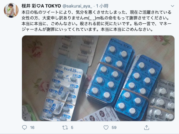 就算你看不懂文章寫了什麼,看到這麼多藥也知道事情大條。發這篇推文的是才剛發表引退作的「桜井彩」,她說出的話十分恐怖ー