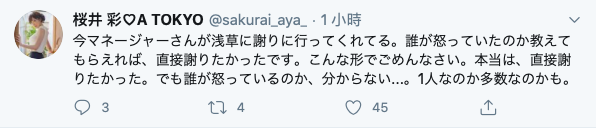 她的發文寫得十分模糊,意思就是她在twitter寫的東西惹火了某個活躍的女性,這人是誰、是一個人還是很多人她也不知道,只知道此事非同小可,她想儘快向對方道歉⋯