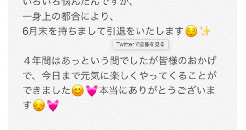 沒說原因,她只告訴大家要在6月底引退,4年來感謝大家的支持,接下來27日(就今天)、31日以及6月的攝影會是最後能見到面的機會。很可惜,台灣和日本目前並沒有解除邊境管制的跡象,所以喜歡這位女優的朋友應該是沒辦法當面和她說再見了〜