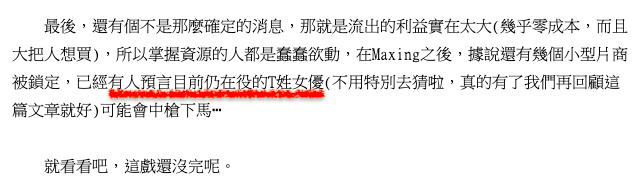 因為流出是門有賺無賠的無本生意,所以資源在手的人都是蠢蠢欲動,至於這位目前還在役的T姓女優是誰呢?答案在昨天揭曉了: