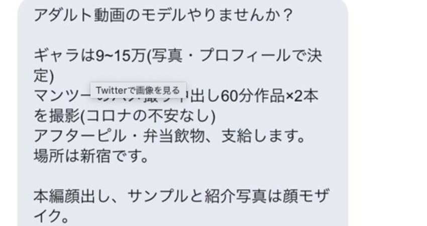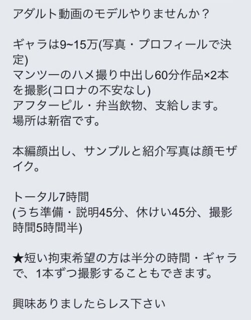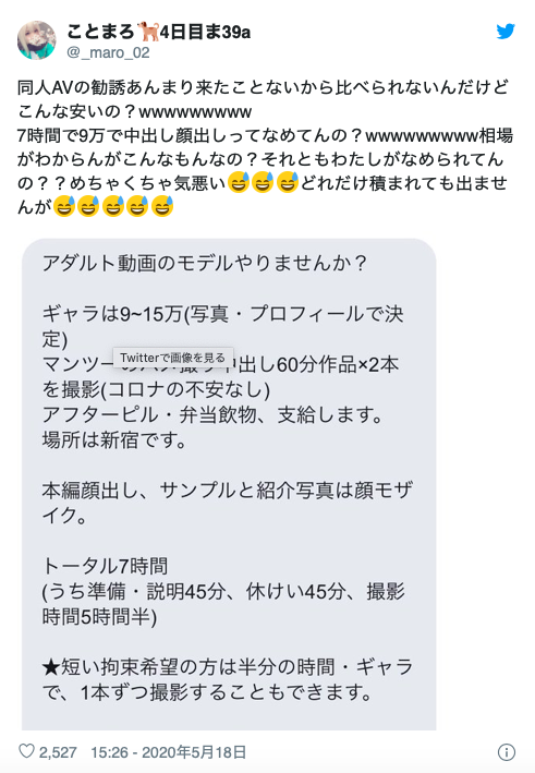 她不是AV女優,而是角色扮演玩家(Cosplayer,コスプレイヤー)ことまろ,她說自己收到了拍片的Offer,對方預計需要7小時的拍片時間、酬勞9~15萬日幣(約台幣2.5萬~4.2萬元),要露臉,一對一演出,會被中出,共要拍攝2支60分鐘長的作品(也就是合計120分鐘),還會提供便當、飲料以及避免懷孕的事後藥,然後保證預告片會打上馬賽克:
