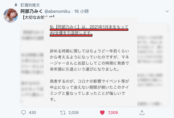 經紀公司Funstar所屬、邁向出道第7年的阿部乃みく(阿部乃美久)昨天發表引退宣言,她預定要在明年(2021)一月底結束AV女優的工作,希望大家能一起見證她暗黑生涯的最後一哩路⋯