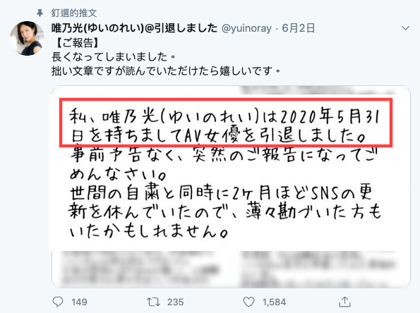 在阿部乃みく(阿部乃美久)預告引退後,去年5月出道的「唯乃光」也在twitter告訴大家不玩了:比較奇怪的是一般女優多是會為退休留一段緩衝的時間讓事務所可以安排告別作或最後的公開活動,但唯乃光不是,她是直接告訴大家我已經在5月31日引退,千山我獨行不必相送〜
