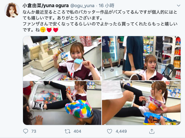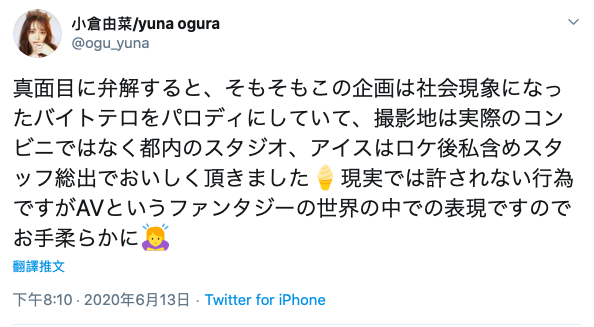 所以這支作品可以說是小倉由菜生涯的代表作,不只評價很高也賣得不錯,所以她在Twitter上放了不少現場拍攝時的照片,但就在這時候有人怒了: