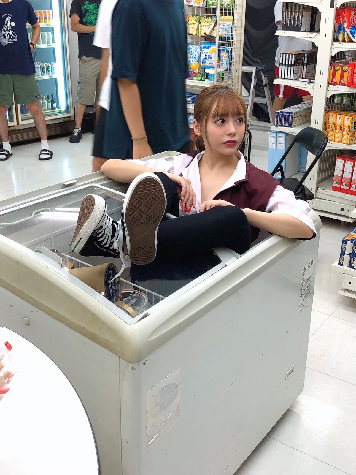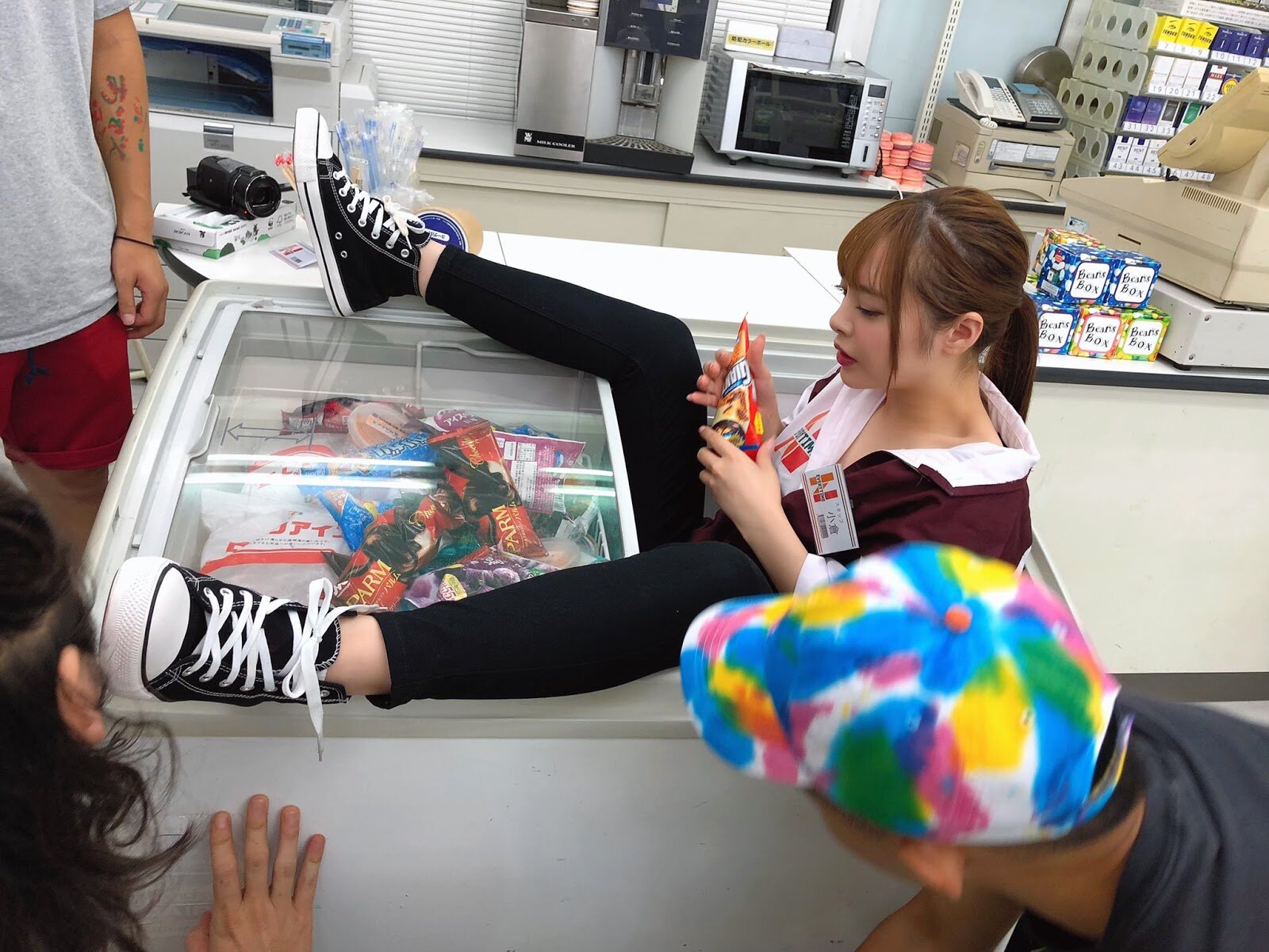 可能是因為之前日本有很多年輕人在超商打工的時候亂搞才讓他看不慣小倉由菜坐在冰箱裡吧?可是瑞凡,他可能沒有搞清楚這是片商搭建的佈景、並不是真正的超商,對此小倉由菜也頗為無奈,只能很嚴肅地說明片中所有的東西都是道具、不是真正能吃的東西~