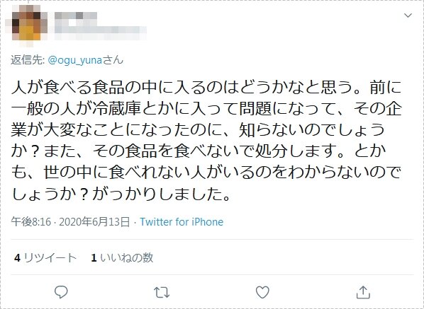 「人是可以跑進吃的東西裡面嗎。之前就因為有人跑進冷藏庫而引發問題,那間公司也為了這件事陷入嚴苛的情況,難道你不知道嗎?然後,請把那些食品全部處分掉。這個世界上還是有沒飯吃的人,難道妳不知道嗎?真令人失望。」留言的人這麼說。