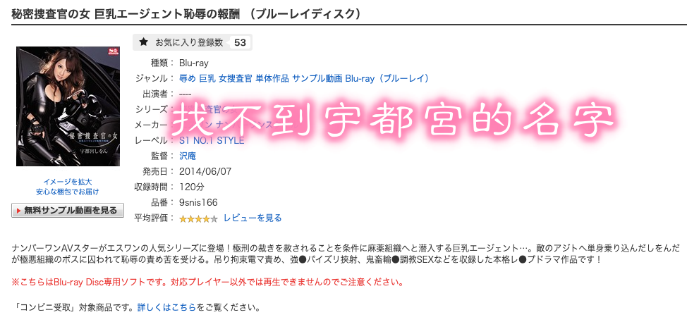 我試了一下,發現至少有兩支作品還可以在FANZA(DMM)上找到,分別是「秘密捜査官の女 巨乳エージェント恥辱の報酬」和「交わる体液、濃密セックス」,而看了作品說明就可以發現FANZA把宇都宮しをん(宇都宮紫苑)的名字去掉了⋯