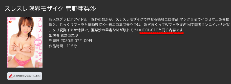 什麼狀況呢?就是這支「スレスレ限界モザイク」,請大家看看演出者是誰?沒錯,就是菅野亜梨沙,就是那個有些人覺得她像史特龍的菅野亜梨沙: