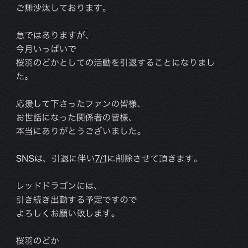 就像她自己說的,一切來得很突然,在今天(6/28)宣布引退後她馬上就要在星期三(7/1)刪掉twitter,目前只打算保留在紅龍(レッドドラゴン,Red Dragon)的陪酒工作: