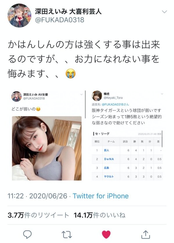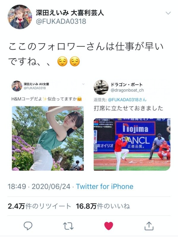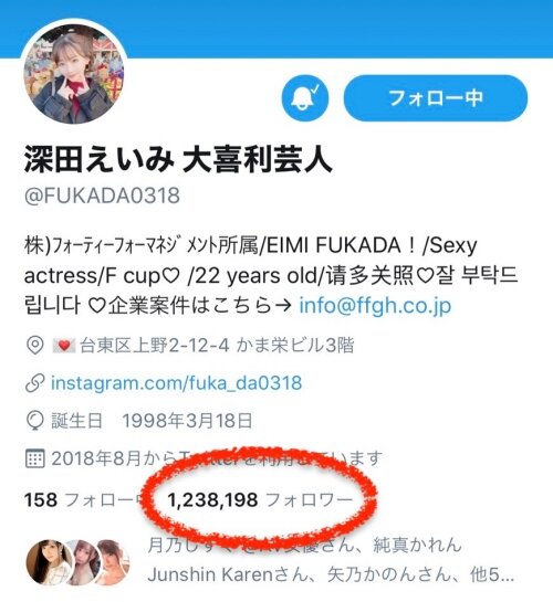 應該很多人不敢置信、應該更多人想知道她是怎麼引爆人氣的:坦白說,雖然追蹤人數還差明日花キララ(明日花kirara,明日花綺羅)40萬左右,但深田えいみ(深田詠美)在Twitter上的爆發力是無人能及的,我們隨便來看幾篇發文吧: