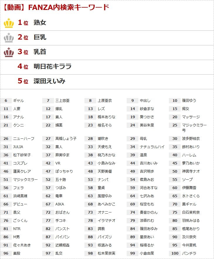 前3名都是關鍵字,分別是熟女、巨乳以及乳首(奶頭)ー這意味著什麼呢?雖然現在松本いちか(松本一香)這樣的貧乳美少女當道,但日本影迷在網站上查詢最多次,應該也是最喜歡的關鍵字告訴我們現在最受歡迎有著大奶的姊姊;至於乳首(奶頭),男女優都有,也很難說影迷喜歡的是那奶不大但一刺激就翹起來的貧乳妹子還是被女優玩弄奶頭的M男企劃,但不怎樣,奶頭確實日本影迷非常有性趣的關鍵字〜