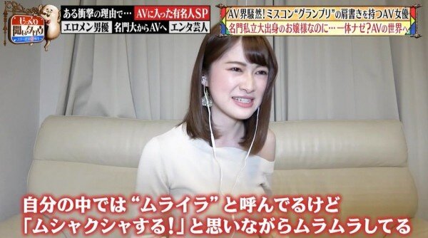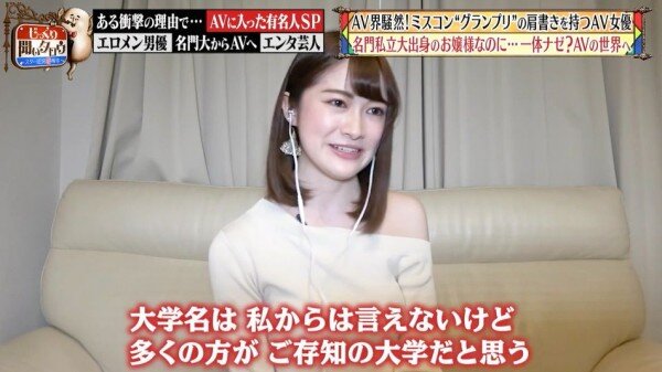 上了節目的她再一次強調自己出身自有很名的私立大學,然後在演出AV前就已經和很多人上床:「打過炮的人挺多的,大概有50人吧。」而最大的爆點是她與眾不同的性癖好:
