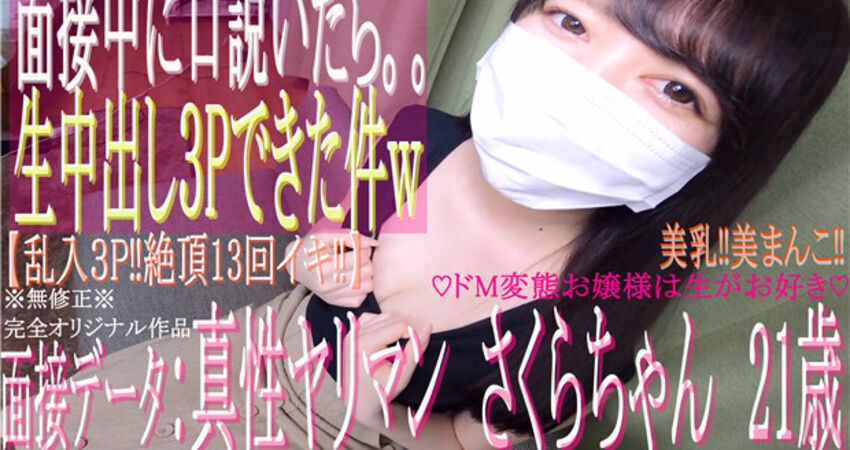 タイトル: 【初撮り】♡21歳の青〇学院に通うお嬢様は真性ドMヤリマン♡面接の途中から。。『3P生中出しハメ撮り‼』※無修正※