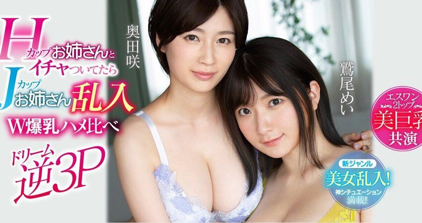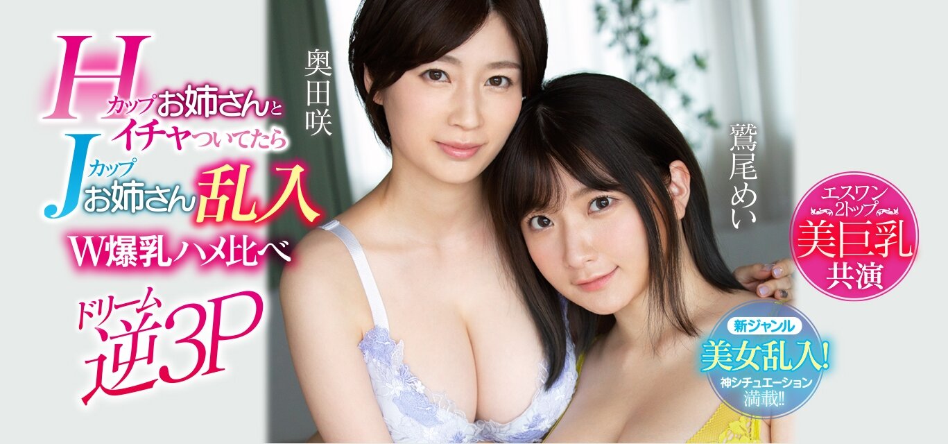 這支「エスワン2トップ美巨乳共演 Hカップお姉さんとイチャついてたらJカップお姉さん乱入してきてW爆乳ハメ比べドリーム逆3P」簡單講就是峰峰相連到天邊ー兩位女優一個H罩杯(奥田咲)一個J罩杯(鷲尾めい,鷲尾芽衣),除此之外兩人年紀差很多身高也一高一矮完全沒有共通點,所以很顯然地,這是一支「賣奶」的作品: