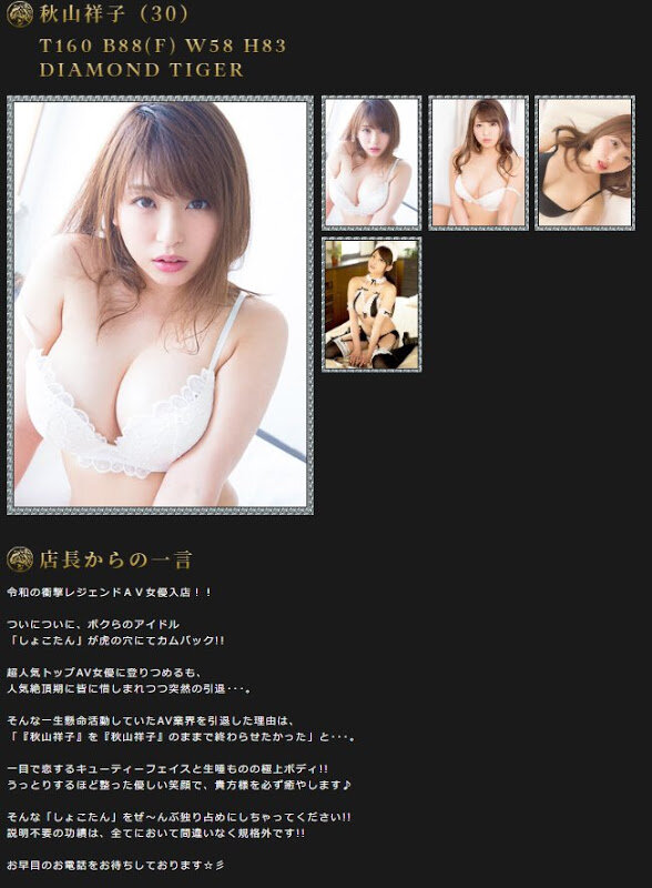 好吧,也許對某些人來說這是個好消息, 2019年,也就是去年10月引退的「秋山祥子」被公布即將前往風俗界名店虎の穴,業者顯然很得意,用「令和の衝擊レジェンドAV女優入店」~