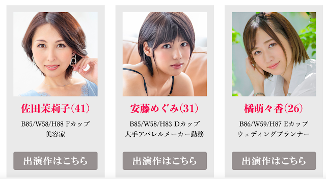 這三人當然是特別挑選出來的,首先登場是佐田茉莉子是四十路的熟女,再來出道的橘萌々香(橘萌萌香)年紀最輕只有26歲,而最後現身的安藤めぐみ(安藤惠)則是剛過三十大關的都會女性;三個不同世代的女優放在同一家片商,很明顯地,SOD集團一定是想說些什麼⋯