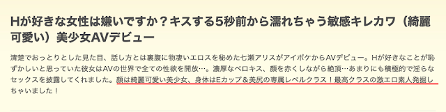 這中間的決策過程我不是很明白,畢竟每個女優有自己的需求、事務所也有他們的策略,但是七瀬アリス(七瀨愛麗絲)的狀況是連片商都在文案告訴大家「有專屬的水準」,因為她臉蛋是綺麗的美少女、身體是E罩杯的美乳配上小而翹的美尻⋯可能是因為片商自己也太難理解一個該去金州勇士隊打球的好手為什麼要跑來打富邦勇士,所以最後只好給七瀬アリス(七瀨愛麗絲)封了個「最高クラスの激エロ素人(最高等級的超強好色素人」的稱號交代過去⋯