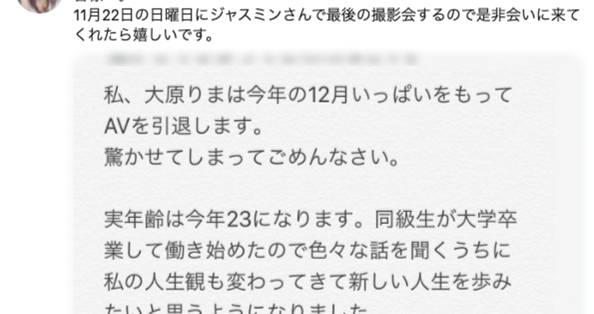 不知道是肺炎疫情看不到盡頭讓這一行愈來愈難混還是真的如她所說的想法有變,總之,經紀公司T-Powers所屬的長身女優「大原りま(大原梨真)」宣布引退,11月22日的攝影會就是最後的活動了: