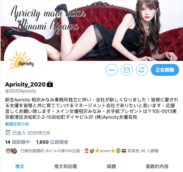 還記得我上次說有位女優解除追蹤自己的事務所改追蹤其他經紀公司嗎?大家可以去看相沢みなみ(相澤南)的追蹤名單,裡面已經沒有和她一起自經紀公司「44」獨立的「Apricity」,而「Apricity」的帳號在8月後也沒有任何更新了⋯