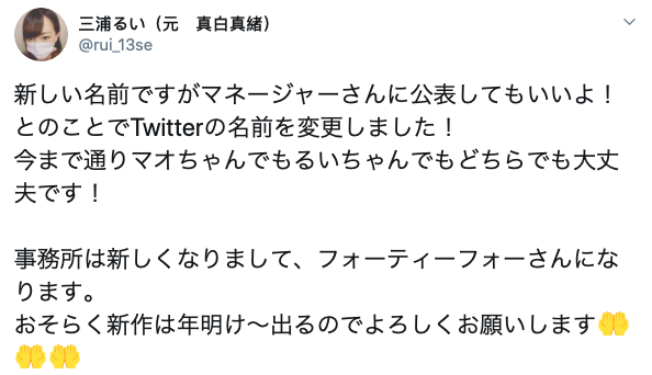 是啊,現在來看早點移籍對真白真緒,喔不,是三浦るい(三浦瑠衣)來說是比較好的事,不過我也順便說一下當初她和T-Powers吵什麼ー因為那也蠻重要的,為什麼她離開了T-Powers?因為合約沒到雙方就結束了合作關係,但三浦るい(三浦瑠衣)覺得自己是辭職瀟灑離去,但T-Powers卻對外宣稱她是被開除了,因為這可能會讓日後求職困難,所以雙方吵了好一陣子⋯